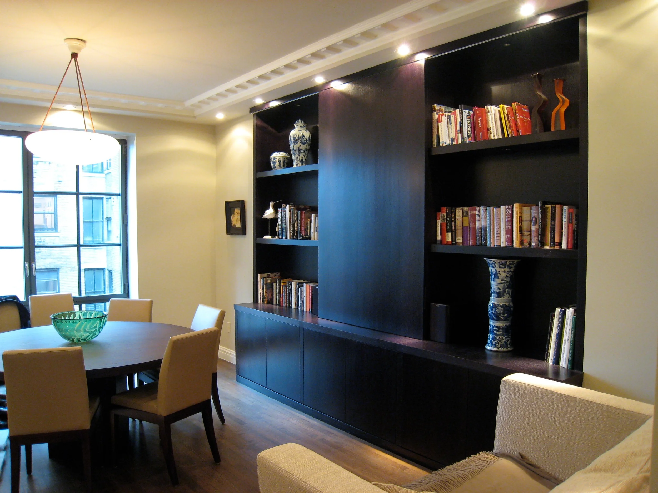 By taking advantage of an existing wall recess, this 11 foot long built-in becomes the focal point of the room without the bulkiness of a free standing wall unit. The dark, subtle grain of tropical Wenge combines with the elegantly styled lower doors to create a modern aesthetic while the single large sliding door provides an elegant cover for the flat panel television during more formal occasions. The open shelving with integrated recessed lighting offer a place to display books and artwork.